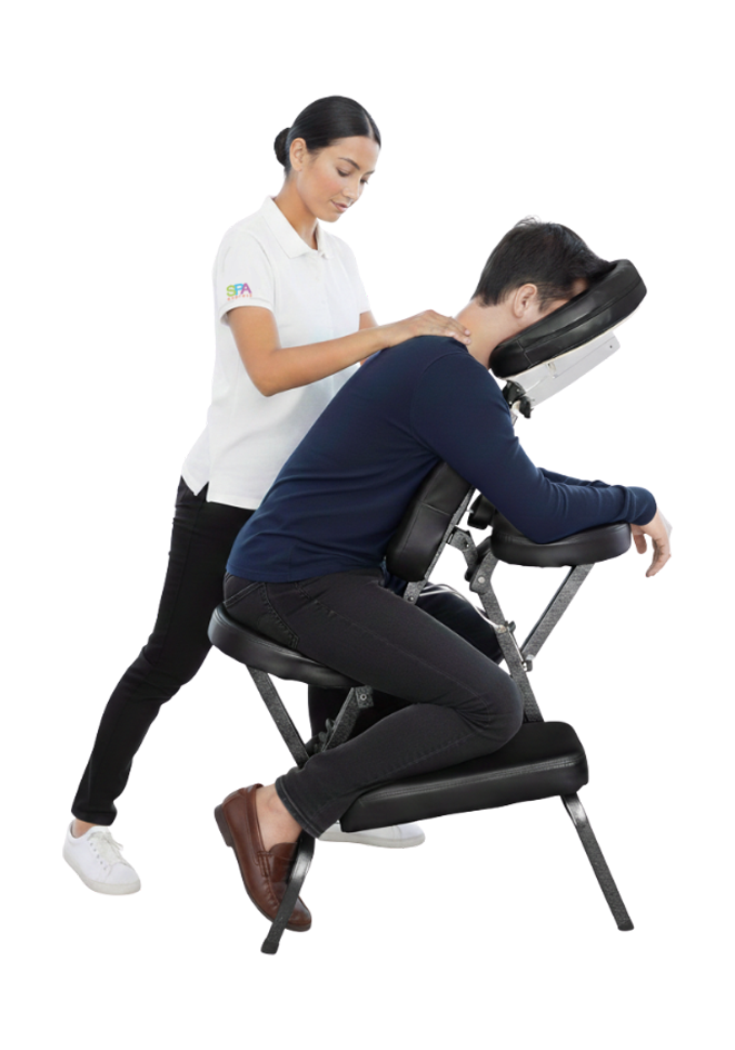 Masaje descontracturante de espalda en silla ergonómica para toda persona con dolencia muscular profunda.